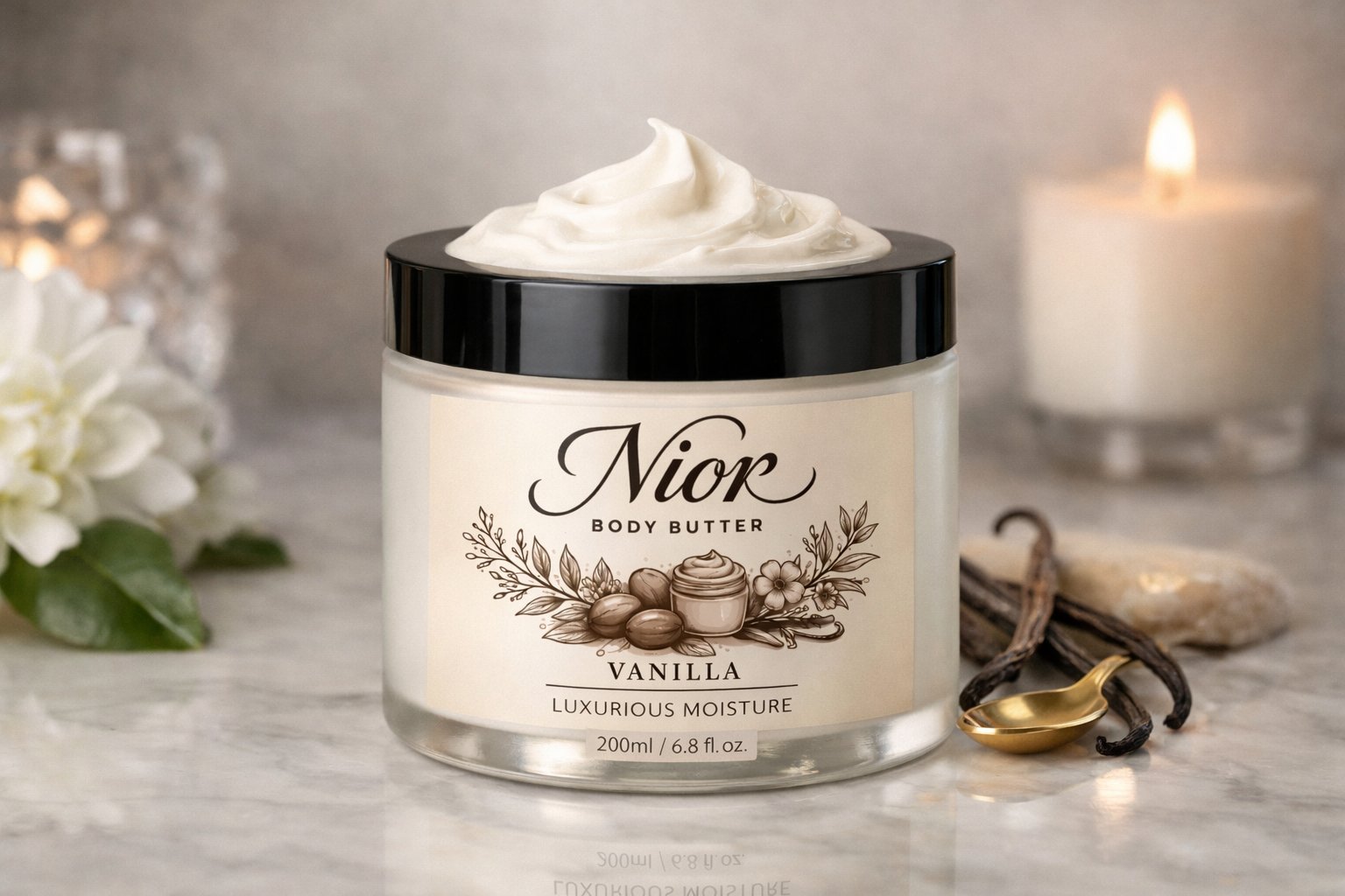 Treat your skin to Nior Vanilla Body Butter- a rich, handmade blend that deeply hydrates while leaving a soft, sweet vanilla scent. Smooth, Nourishing, and effortlessly luxurious .